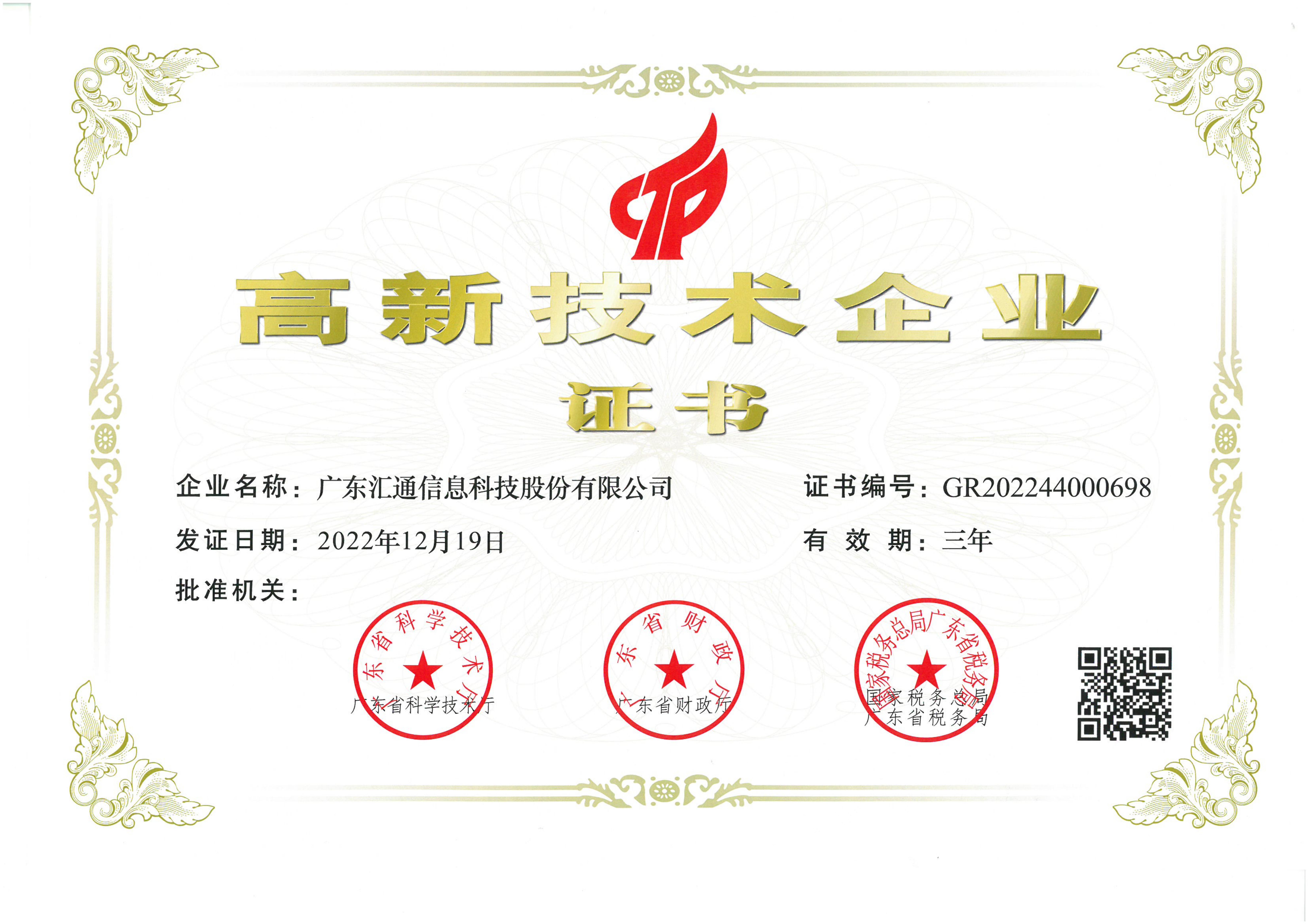 高新技术企业证书